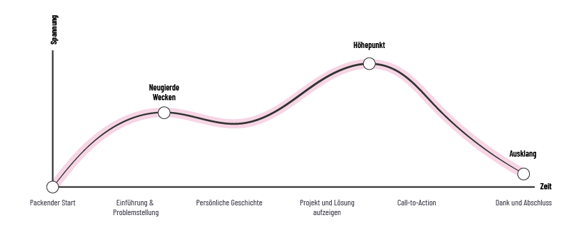 Am Anfang wir mit einer fesselnden Aussage oder einer einprägsamen Szene begonnen, welche das Interesse des Publikums weckt und sie dazu bringt, mehr über Ihr Projekt erfahren zu wollen. Dies könnte eine Metapher, eine Frage oder eine kurze Anekdote sein.