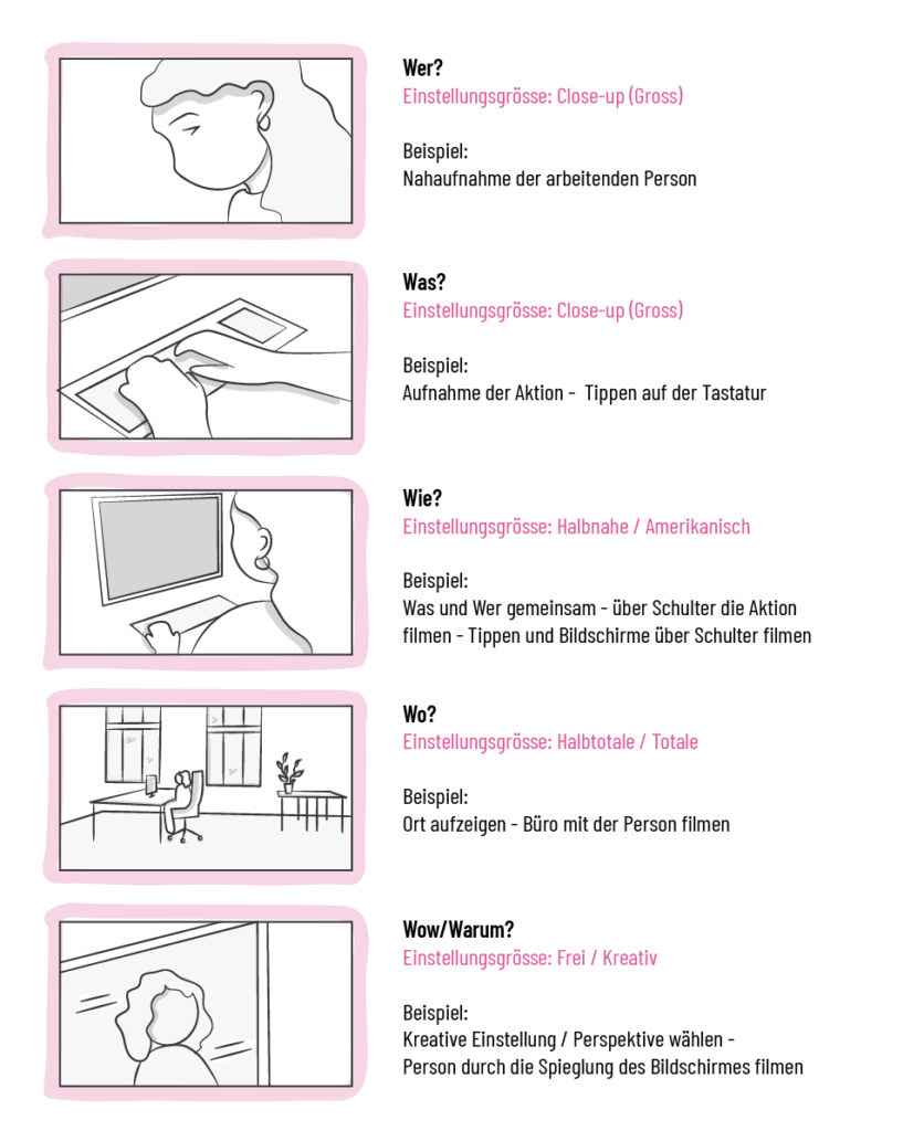 Die «five-shot» Methode/Technik ist eine Technik von Martin Goldmann und dient als Unterstützung zur visuellen Erzählung von Handlungen einer Person. Wann immer und wo immer gedreht wird, wird versucht, von einer Szene mindestens fünf Einstellungsgrössen zu bekommen. Die 5 Einstellungsgrössen sollten die journalistischen W-Fragen: „Wer“/„Was“/„Wie“/„Wo“/ „Warum“/ („Wow“) beantworten.