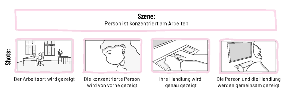 Eine Person ist konzentriert am Arbeite, dies ist die Handlung und somit die Szene. In dieser Szene werden folgende Shot abgebildet: Der ganze Arbeitsplatz wird gefilmt (Totale), Die Person blickt konzentriert auf den Bildschirm (Halbnahe), Die Person ist am Tippen und die Tastatur wird dabei gezeigt (Nahe), Zum Schluss wird die Person mit der Handlung gezeigt (Halbnah).