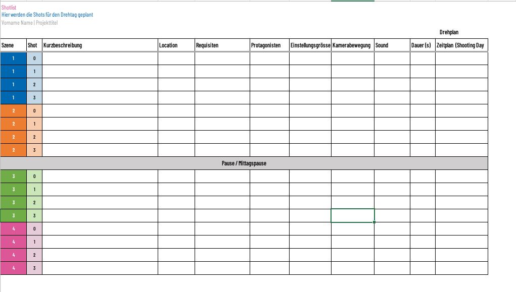 In der Vorlage wird die Shotlist und der Drehplan kombiniert. Die Vorlage kann im Download Center heruntergeladen werden.