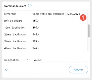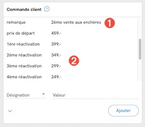 Dès que celle-ci a eu lieu, il faut ajouter dans le champ d’ordre, derrière la remarque➊ « 2ème vente aux enchères », quand la 2ème enchère a été lancée.