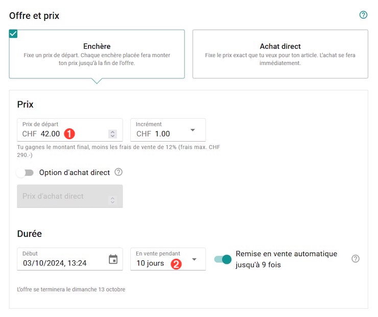 Le prix de départ➊ est repris de l’application Plusvalue. La durée➋ indiquée dans les détails de l’offre doit être de 10 jours.