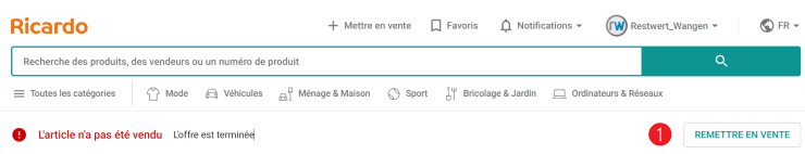 Si un article n’est pas vendu après la dernière réactivation, Ricardo enverra un e-mail « Non vendu ». Les ventes aux enchères qui ont échoué restent visibles pendant 30 jours sous les offres actives. Les articles ne peuvent plus être vendus aux enchères, mais les personnes intéressées ont la possibilité de faire des propositions de prix. De plus amples informations à ce sujet sont disponibles dans les instructions Achats et livraisons. La suite de la procédure dépend du souhaits du/de la fournisseur·euse. Il/elle a le choix entre trois possibilités : un don, une reprise de l’article ou une deuxième vente aux enchères.