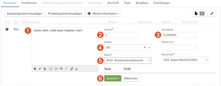 Mit Speichern➏ wird die Standardposition der Rechnung hinzugefügt.