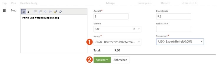 Mit Speichern➋ wird die Einfügung von Porto und Versandkosten abgeschlossen.
