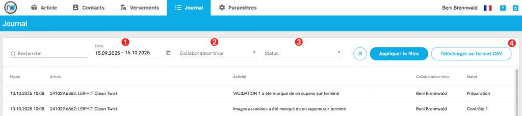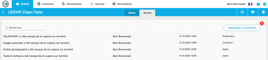 ➍ Téléchargement CSV du journal : la liste peut désormais être téléchargée au format CSV. Cela permet une évaluation précise dans Excel. Le fichier CSV généré contient les lignes suivantes : date, heure, numéro d’article, activité, collaborateur·trice et statut. Les filtres sélectionnés ont une influence sur les données incluses dans le fichier CSV.